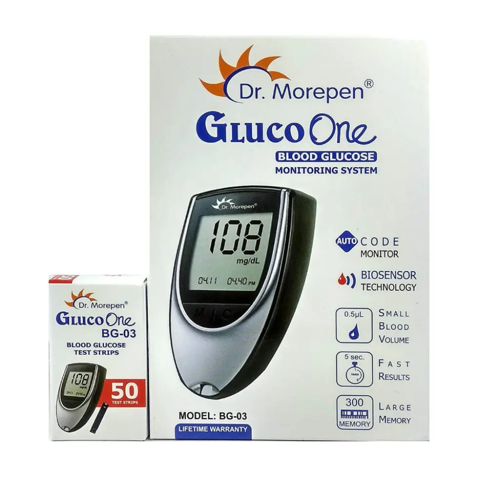 Gluco One Blood Glucose Monitoring System provides fast, accurate blood sugar readings at home. Easy to use, reliable, and ideal for daily diabetes monitoring.. This is a box for the Dr. Morepen Gluco One Blood Glucose Monitoring System, model BG-03. It is a smart glucose monitor that measures blood glucose levels quickly and accurately. It requires a small blood sample of 0.5µL and provides results in 5 seconds. The device has a large memory that can store up to 300 test results. The product comes with a lifetime warranty.